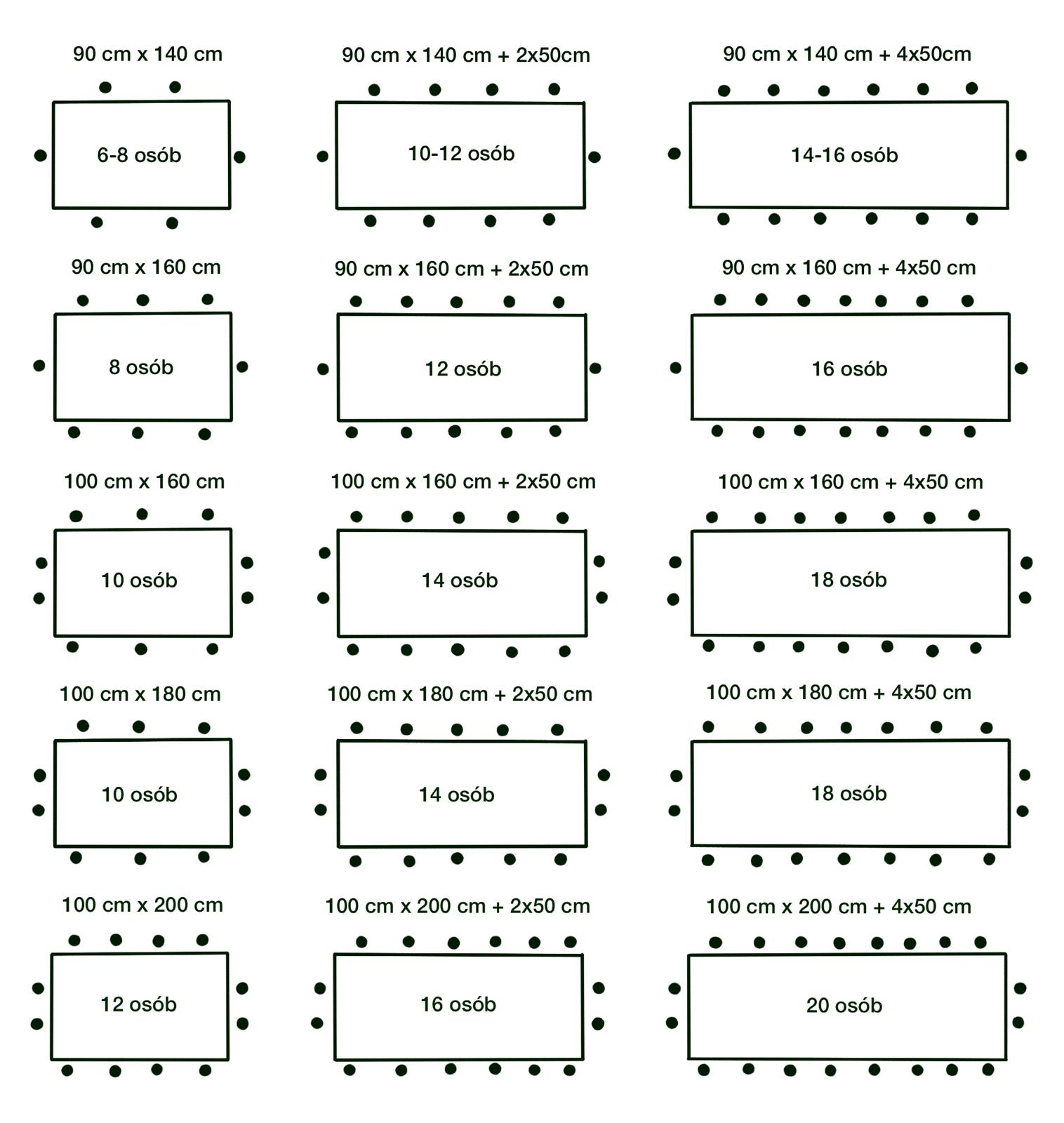 (1 osoba liczona jest jako +/- 50 cm, liczba osób zależy od wielkości krzeseł, w tabeli została przedstawiona szacunkowa liczba osób)