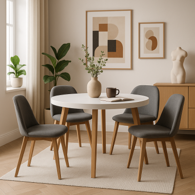 STÓŁ OKRĄGŁY ROZKŁADANY S-3 RBB BIAŁY NA OKLEINIE NATURALANEJ DĘBOWEJ, NOGI BUKOWE