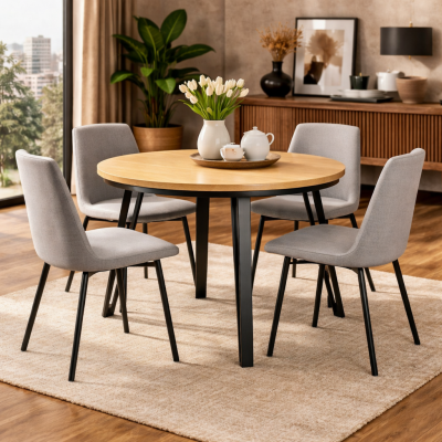 Stół okrągły rozkładany S-43MC to połączenie naturalnego piękna drewna z nowoczesnym, loftowym charakterem. Blat wykonany z wysokiej jakości forniru dębowego zachwyca autentyczną strukturą słojów, a czarne metalowe nogi nadają całości wyrazisty, designerski wygląd.