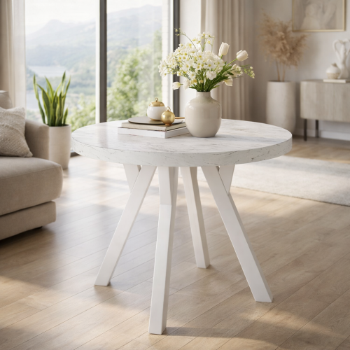 STÓŁ OKRĄGŁY ROZKŁADANY DO JADALNI MARMUR L-3 BIAŁY MARMUR CARARRA, NOGI BIAŁE