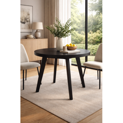 Okrągły kształt stołu sprzyja wygodnej komunikacji i buduje przyjazną atmosferę przy wspólnych posiłkach, a uniwersalna czarna kolorystyka świetnie pasuje do wnętrz nowoczesnych, loftowych i klasycznych.