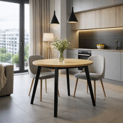 STÓŁ OKRĄGŁY ROZKŁADANY L-84 BLAT DĄB HALIFAX NAT, NOGI BUKOWE CZARNE