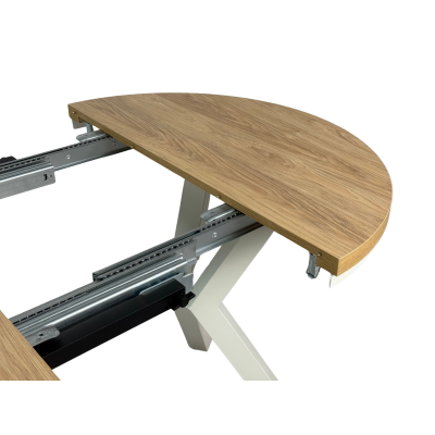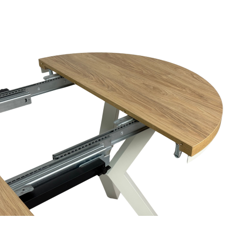 W przypadku stołów z 3 I 4 wkładkami, na prowadnicy zamontowane są dodatkowe, składane, metalowe nogi podtrzymujące środek stołu. Prowadnica umożliwia rozłożenie stołu przez jedną osobę.