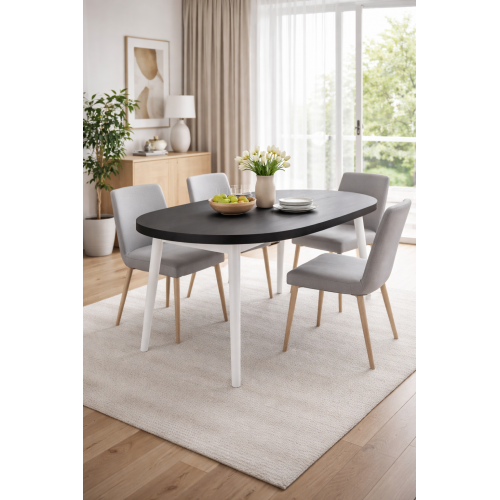 STÓŁ OKRĄGŁY ROZKŁADANY S-85 CZARNY NA OKLEINIE NATURALNEJ DĘBOWEJ, NOGI BUKOWE BIAŁE