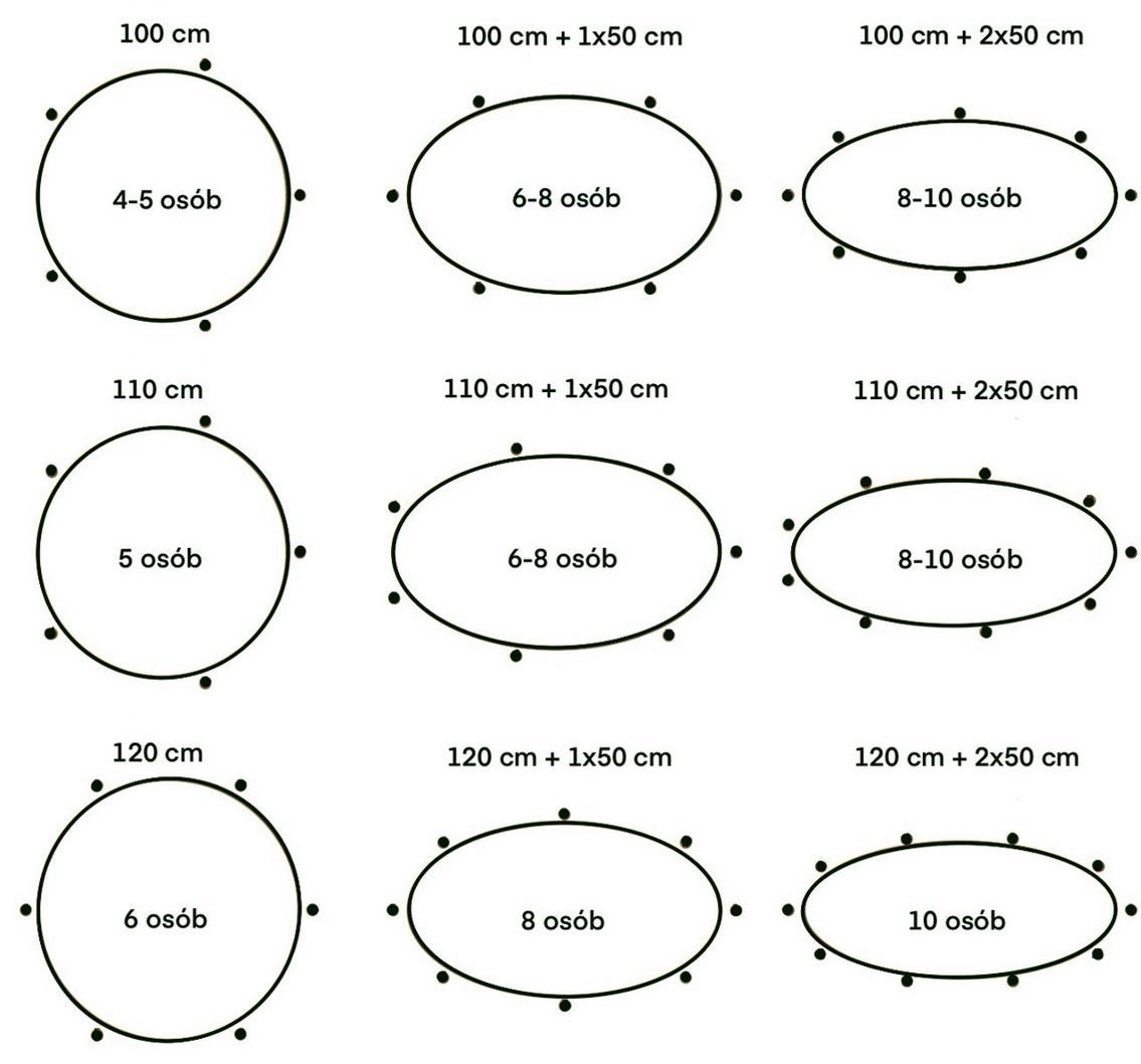 (1 osoba liczona jest jako +/- 50 cm, liczba osób zależy od wielkości krzeseł, w tabeli została przedstawiona szacunkowa liczba osób)