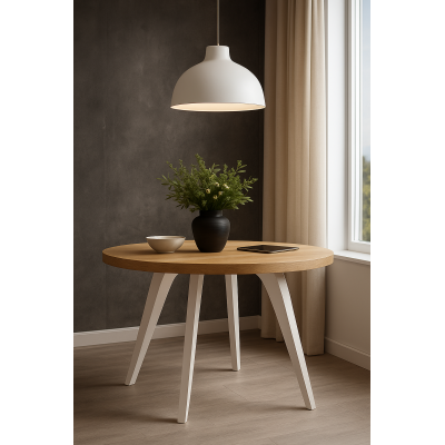 STÓŁ OKRĄGŁY ROZKŁADANY L-90, BLAT DĄB HALIFAX NAT, NOGI BIAŁE