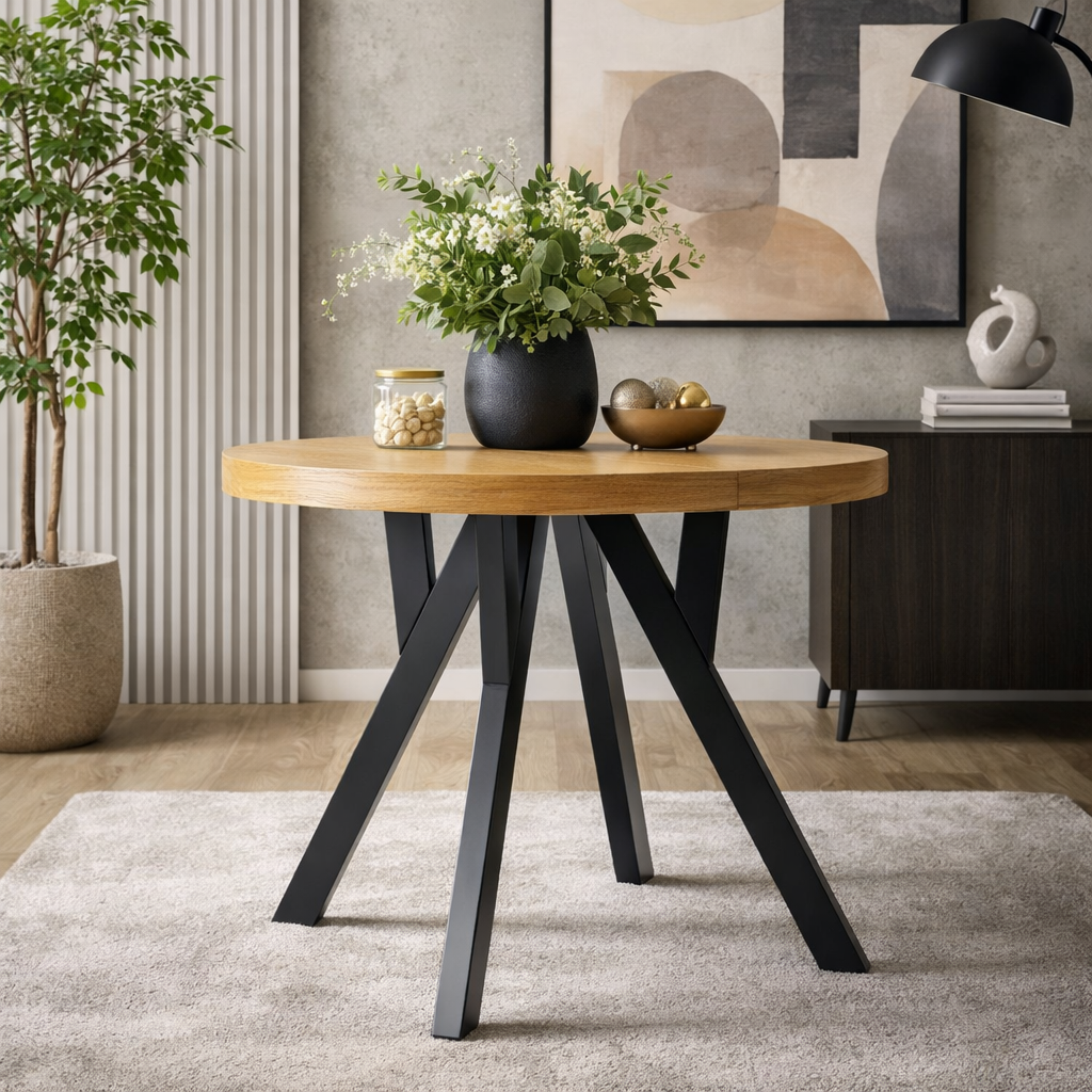 Nowoczesny stół okrągły rozkładany – dąb naturalny, czarne nogi