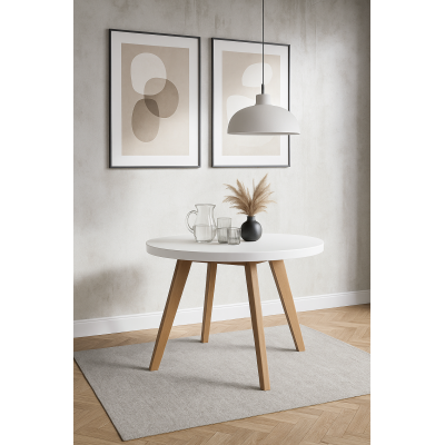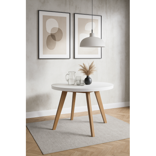 STÓŁ OKRĄGŁY ROZKŁADANY S-3 RBD BIAŁY NA OKLEINIE DĘBOWEJ, NOGI DĘBOWE