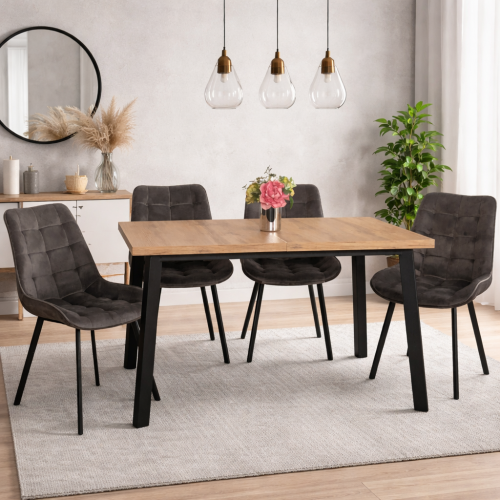 Zestaw stół rozkładany LV-42 z krzesłami KUBA to idealna propozycja dla osób poszukujących nowoczesnych mebli do jadalni lub salonu, które łączą funkcjonalność z ponadczasowym designem. Połączenie dekoru dąb Wotan z czarnymi, metalowymi nogami nadaje całości charakteru loftowego, który doskonale wpisuje się w aktualne trendy aranżacyjne. Dzięki temu komplet świetnie sprawdzi się zarówno w nowoczesnych, jak i bardziej klasycznych wnętrzach, dodając im elegancji i przytulności.